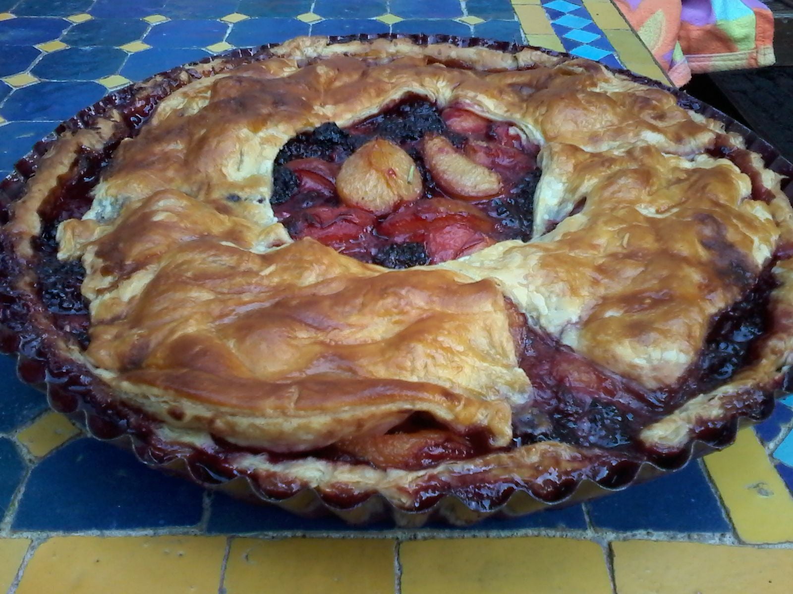 Ik heb dit jaar maar een beetje getuinierd en kon gister de eerste pruimen en bramen van de bomen plukken zodat ik vanmorgen om 8 uur (!?!) al een pruimen/bramen/rozemarijntaart stond te bakken.